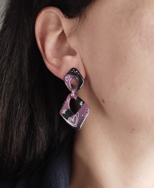 El modelo Galaxia mezcla tonos morados y negros con detalles dibujados a mano, creando un diseño original y lleno de personalidad. Son perfectos para quienes buscan un pendiente diferente para San Valentín o para cualquier ocasión especial.